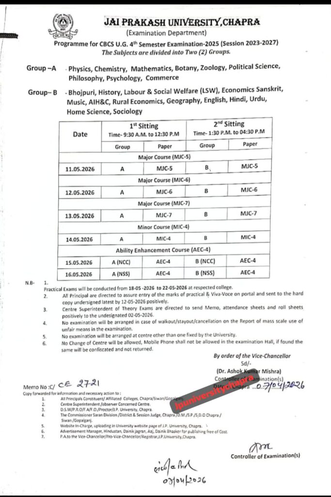 JP University UG 4th Semester Admit Card 2023 27 Kab Aayega : Jai Prakash University | JPU Official Website के द्वारा स्नातक चतुर्थ सेमेस्टर सत्र 2023-27 के परीक्षा रूटीन जारी कर दी गई है। 11 May 2026 से स्नातक का यह परीक्षा प्रारंभ होने जा रहा है तथा 16 May 2026 तक यह परीक्षा चलने वाला है।