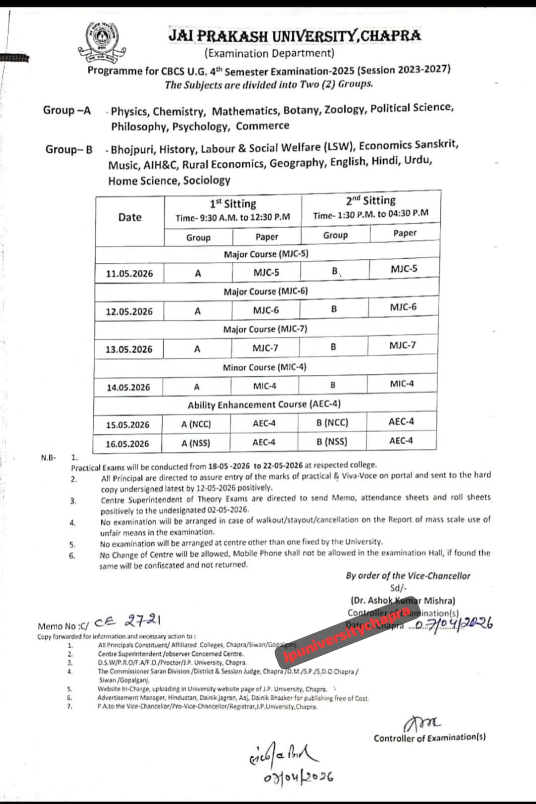 JP University UG 4th Semester Admit Card 2023 27 Date (2026)